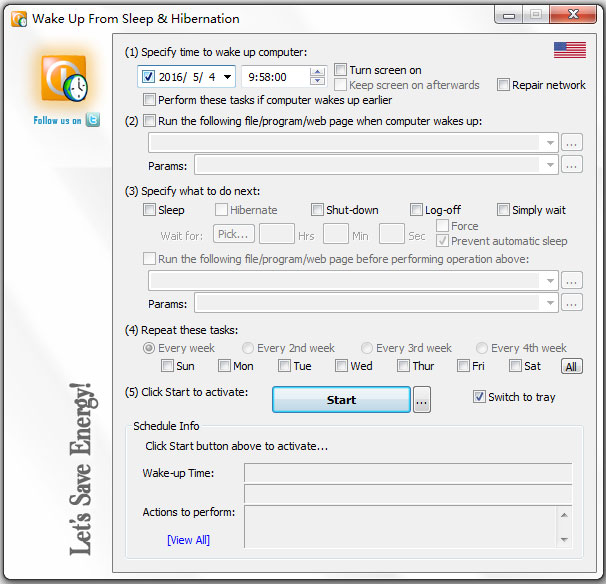 WakeupOnStandBy是一款自动将电脑从待机状态唤醒的工具。用户可以设定唤醒时间,并可以在唤醒后运行某个程序,甚至设定待机时间。