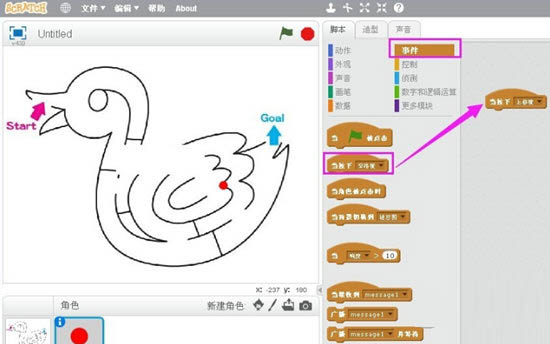点事件,将“当按下空格键”拖到右边的编辑区,并改为当按下上移键;