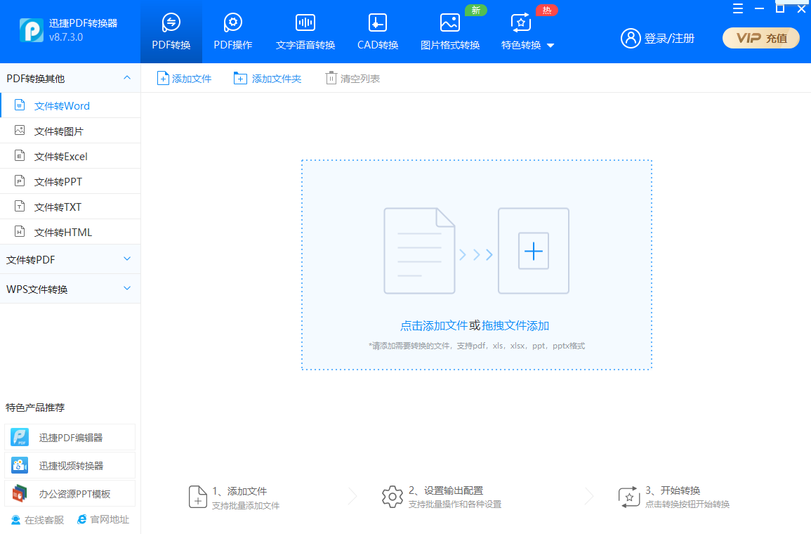 迅捷PDF转换器已经不再仅仅局限于普通的PDF转换Word的功能,全面支持多种文件格式之间的转换,包括Word、Excel、PPT、HTML、TXT,图片等等。