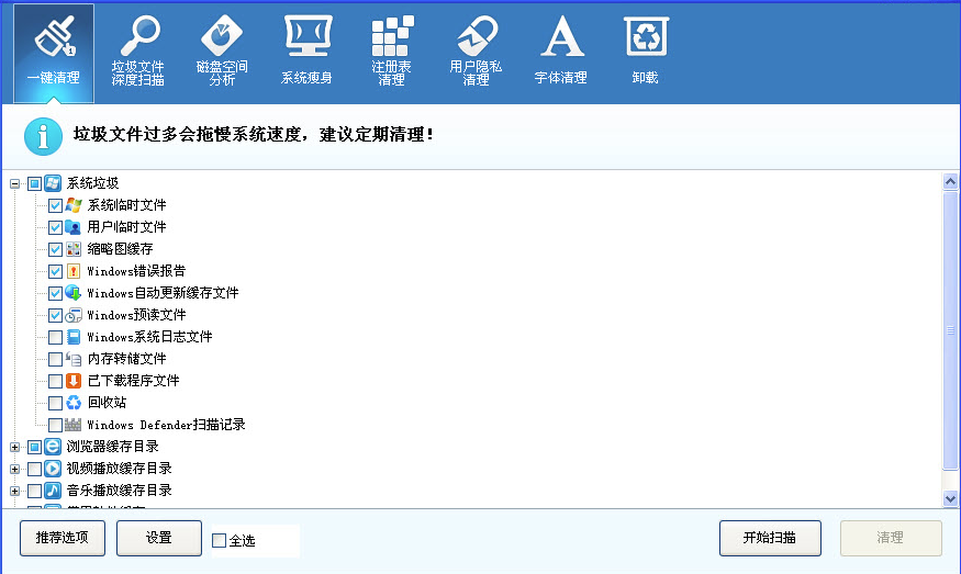 垃圾文件深度清理、注册表清理、用户隐私清理、系统瘦身、字体清理、磁盘空间分析、重复文件查找、软件卸载。