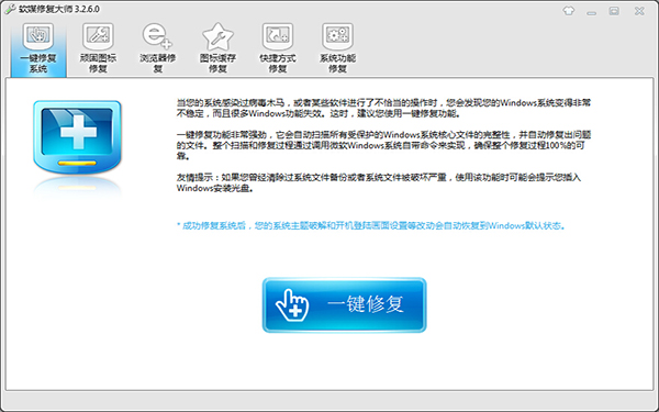魔方修复大师具系统修复、浏览器修复、图标修复、快捷方式修复、顽固图标修复以及系统功能修复,修复成功后均为系统默认状态。