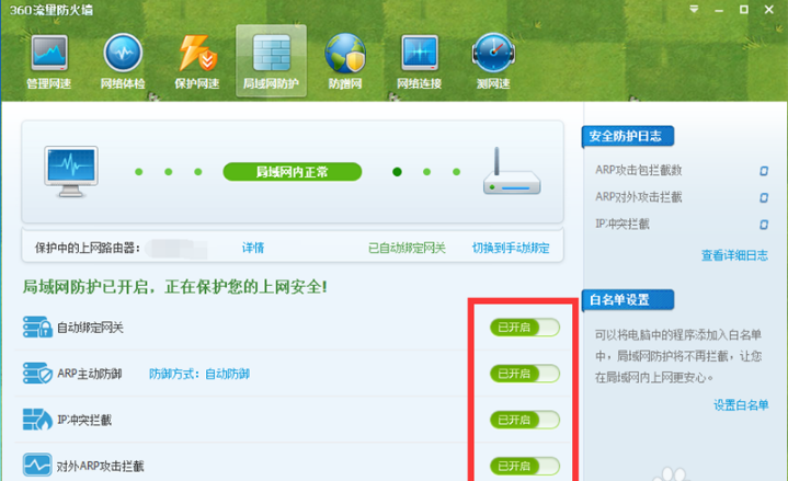 4、局域网防护:非常重要的一个功能。按照360安全卫士推荐开启项目,最后一项局域网隐身,不到万不得已的情况再开启,否则影像局域网用户。