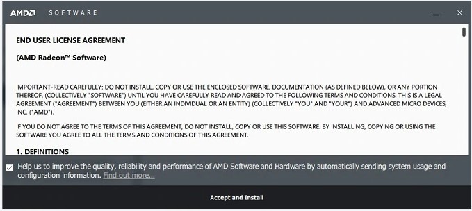 单击 接受并安装 以继续,或关闭窗口以退出 AMD 驱动程序自动检测工具。