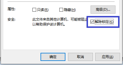 第二种方法,在安装执行文件上右键单击,点击‘属性’,然后选择上‘解除锁定’,