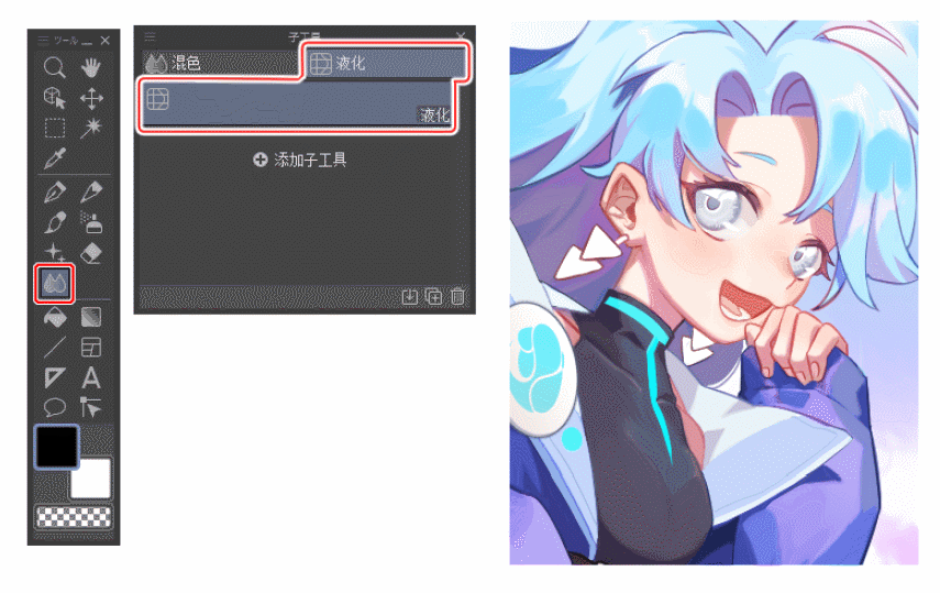 在“混色”工具中,新增“液化”工具。使用此工具,可以如笔刷一般在画布的图层上直接描画内容,并改变图像的形状。