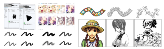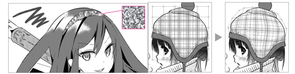 漫画制作不可少的网点功能也很齐备。无论是刮网,贴网,还是调整线数、浓度,抑或更改网点的形状,都可在优动漫 PAINT中轻松操作。贴网后亦可进行任意加工。可以根据角色身体的曲线,变换网点图案,甚至进行歪曲操作。 软件中还收录了大量素材,可用作图案网点。