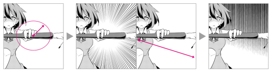 【集中线】、【速度线】 子工具专用于绘制效果线,使用此类子工具可自动生成复杂的效果线,其效果及笔触与手绘近似。