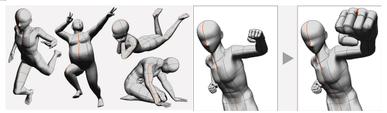 优动漫 PAINT搭载的漫画透视功能,可以轻松实现漫画式的透视效果,比如不改变人物的位置,特写直逼眼前的拳头。该功能属于利用3D模型辅助作画的功能之一,即便改变模型的姿势或角度,也能即时获取漫画透视效果,适用于草稿的绘制。