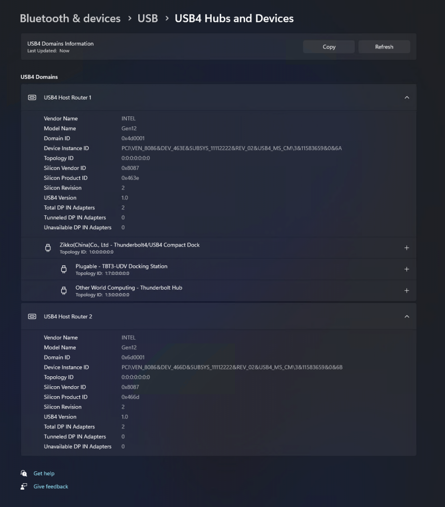 微软正在设置 > 蓝牙和设备 > USB > USB4 Hub 和设备下为用户添加 USB4 Hub 和设备设置页面。USB4 为扩展坞、高性能外围设备、显示器和充电提供了新的生产力场景。USB4 设置页面提供有关系统的 USB4 功能和支持 USB4 的系统上连接的外围设备的信息。如果用户需要设备制造商 (OEM) 或系统管理员的支持,这些旨在帮助进行故障排除。该页面提供的功能包括: