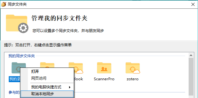 2. 打开同步文件夹管理界面,右击需要设置的同步文件夹,选择【取消本地同步】;