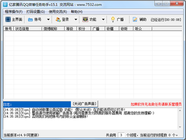 亿家QQ微博管家辅助是一款纯辅助工具。批量登录无限个QQ,自动保存上登录的的用户,强大的数据库功能,一键发布微博广播、批量秒听用户、一键转播广播、一键点评广播。一键收藏广播、保存记事本、发布私、邀请互听功能。刷听众功能,从此,粉丝都是浮云。添加在线发布广播功能。添加自动点评别人的广播。