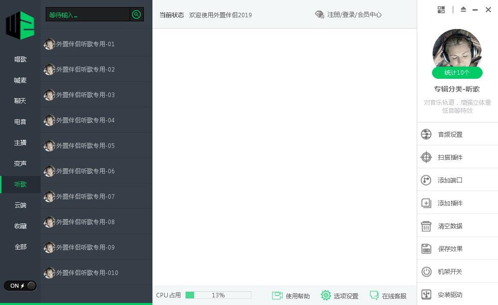 外置伴侣(也称新版一键电音),通过模块化的VST插件管理和DIY连线,可以实现非常多的声卡音效,如混响唱歌,MC喊麦。男女变声,特殊魔音/机器音/环绕音等等。 除了软件自带的音效以外,还可以通过云端下载你喜欢的各种音效(本功能仅供会员使用)。