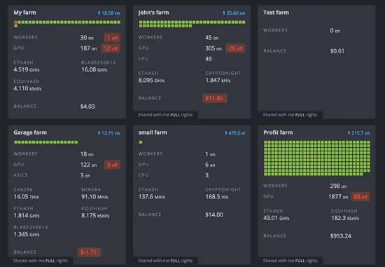 单独管理和配置每个钻机,无论是一台还是几千台。使用Flight Sheets即时切换池,钱包和硬币组合。为您的GPU创建超频配置文件,并在几秒钟内更改整个服务器场中的矿工配置。