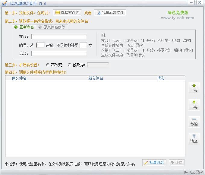 飞云批量改名助手是一款小巧且易操作的文件批量改名工具,支持“批量重新命名”和“批量原文件名修改”两种文件的重命名方式,而且还能够支持原文件名恢复,飞支持自定义文件扩展名,支持上移,下移,移除,清空,鼠标拖拽排序。