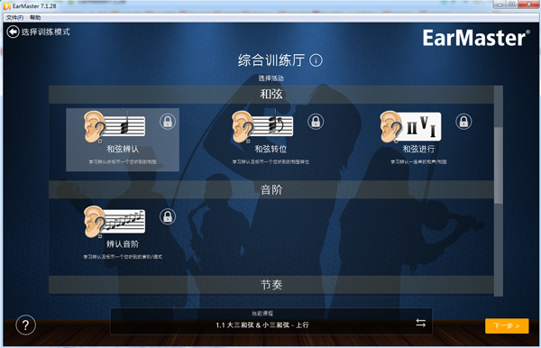 EarMaster 7包括14种教学活动:音程比较、音程辨认、音程歌唱、和弦转位、和弦进行、辨认音阶、节奏视唱、 节奏模仿、节奏默写、节奏错误检查、旋律视唱、旋律模仿、旋律听写等。超过2000个练习和课程将帮助您更好地识别、 录制、播放和视听。 EarMaster 7的大部分活动可以使用麦克风或MIDI键盘来唱歌、拍手或播放您的答案。