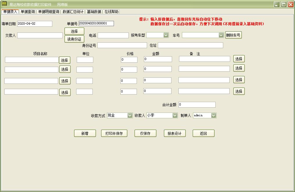 易达驾校收款收据打印软件是易达软件推出的针对驾校管理的收款收据打印软件,该软件支持数据与服务器联通,支持多台电脑同时联网操作,拥有开单打印收据,身份证读取等功能,极大提升收据的处理效率,操作简单,功能强大,深受广大朋友喜欢。