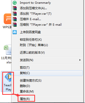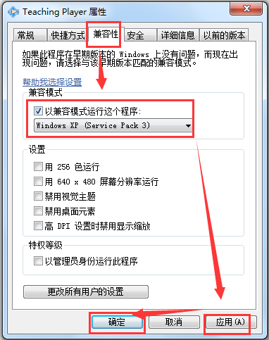 2、如果不行,则右键播放器—“属性”—勾选“以兼容模式运行”,并选择兼容模式为“windows xp”。