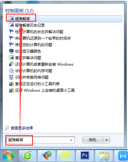 1、点开始菜单,在搜索框里打“疑难解答”,然后选“疑难解答”。
