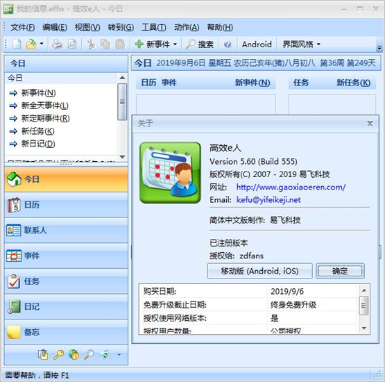 高效e人是集通讯录、日程安排、任务计划、公历农历、电子日记、便笺备忘、密码管理、网址收藏等诸多功能于一身的个人信息管理软件。软件具有集成化的界面,统一的操作方式。您无需分别打开几个不同的程序来管理您的个人事务。