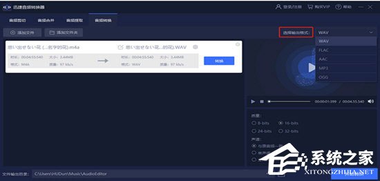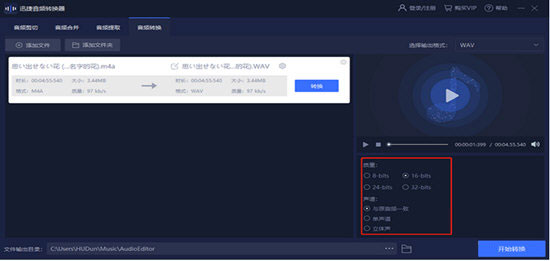 2、音频文件添加完成之后,我们就可以在右侧编辑栏中看到一系列音频参数,可以根据实际情况选择转换后的音乐质量、声道等;