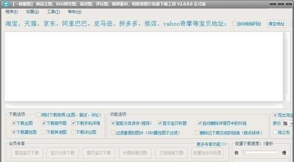 3、软件只有不到3MB的体积,但功能齐全,绿色免安装软件。主要功能包含:国内外主流商城、QQ相册、又拍相册、图虫相册等上百个平台一键搬图。人性化软件设置,通过设置可以生成不同的文件夹名称、图片名称等。还可以下载买家晒图、主图视频、描述视频、评论视频等等,功能非常强大。