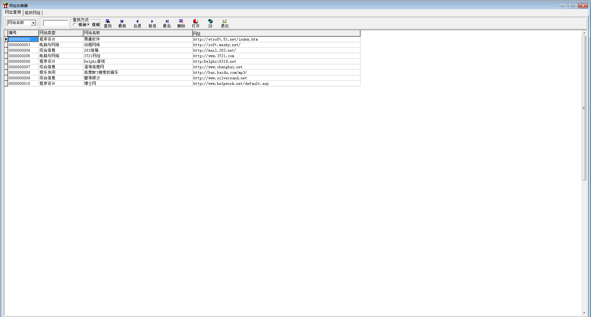 1、网址收集器:选择“修改网址”选项卡,按“添加”按钮即可录入从Internet上收集的网址,录入后按“保存”;选择“查询网址”则可按网站类型、名称或网址的关键词进行模糊搜索,当列表框中选“网站类型”时,则自动显示类型列表框,其内容可用主界的“网站类型”由用户自行添加或修改;双击某网址即可直接用本浏览器浏览网页,单击工具栏的“用IE浏览”则或用IE浏览器浏览网页。
