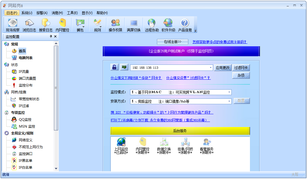 网路岗破解版是专业的网络监控管理软件,是国内企业网络管理人员必备的局域网监控软件首选安全产品。使用期限为:终身,能够支持300用户。