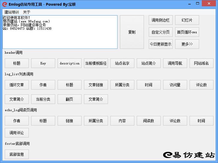 Emlog仿站专用工具是一款Emlog标签集合程序,可以生成emlog类型网站的各个部位的代码,header调用、log_list列表调用代码都可以生成,提高您的工作效率,帮助您进行网站一键制作,只需打开软件,点击需要的代码标签复制修改即可。