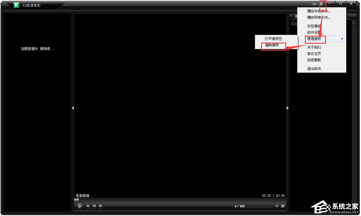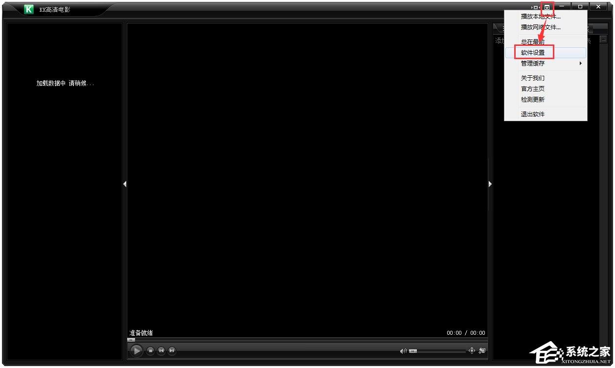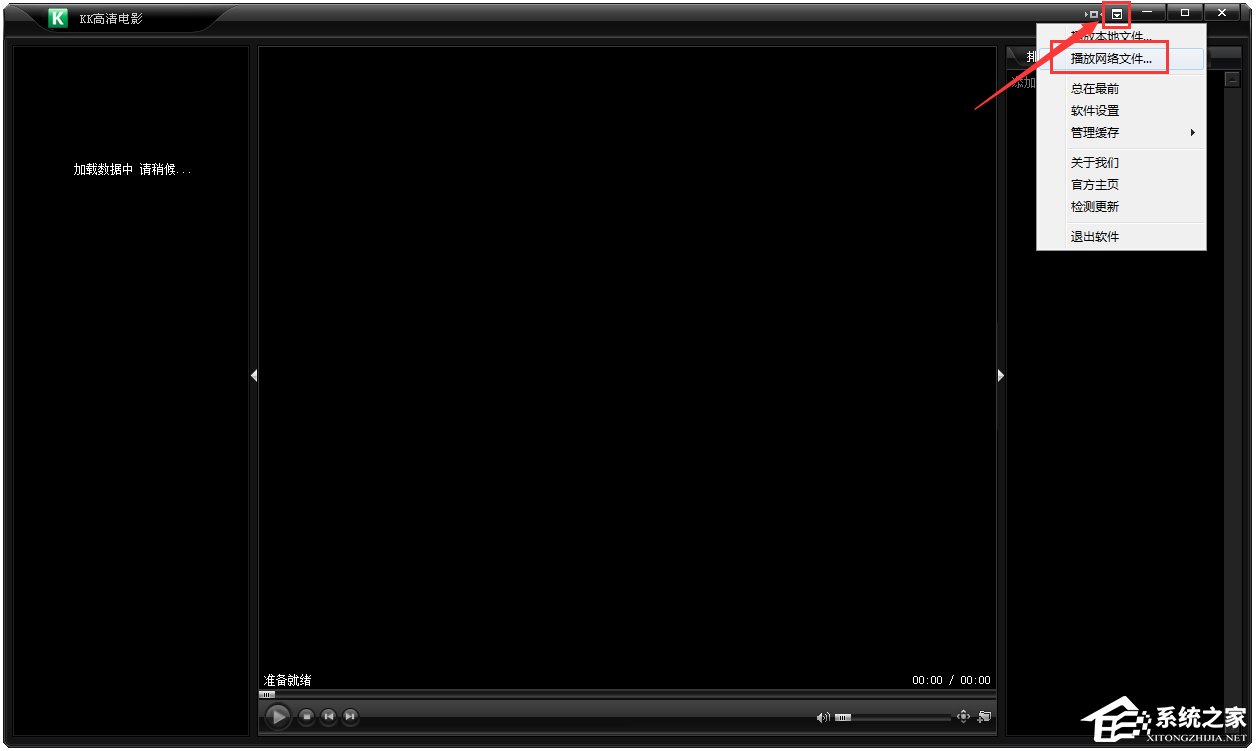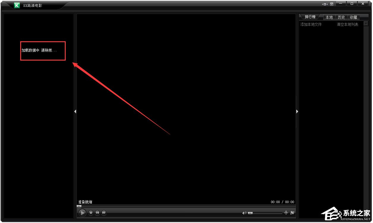 1、打开了播放器后,就会发现黑乎乎的界面,什么也没有。左边还是“加载数据中,请稍后……”右边也什么都没有。