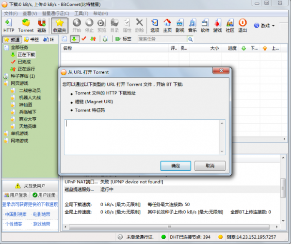 2、从URL打开Torrent文件:点击“文件”,在弹出的选中点击“从URL打开Torrent”后,将URL复制至对话框中,等待系统下载Torrent文件后,选择下载位置,即可开始下载;