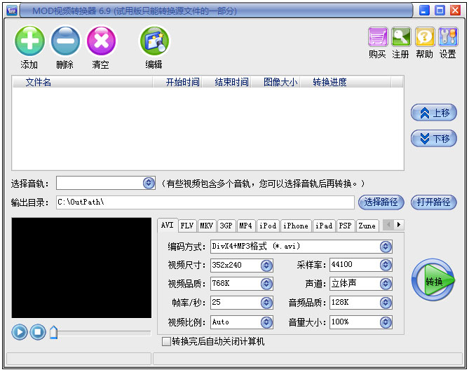 支持MOD视频格式转换输出 AVI高清,H.264/Mpeg-4 AVC高清,MKV高清,WMV高清和MOV高清视频格式。