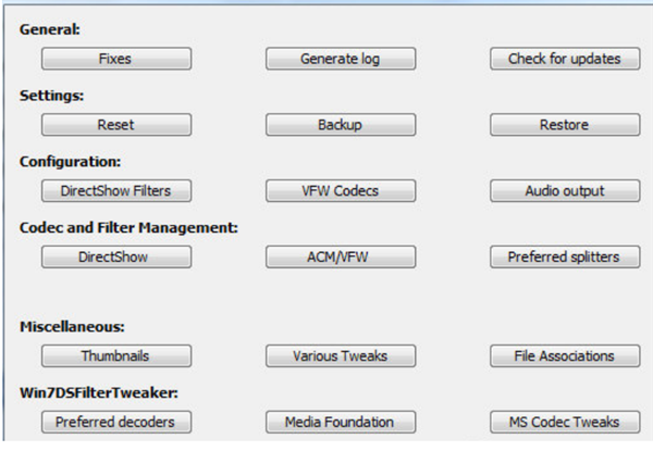 所有你需要做的就是运行这个应用程序(不需要安装),你将看到一个选项菜单,你可以选择程序要执行的动作:修复问题,启用或禁用某些编解码器,甚至生成 一个基本的TXT报告。