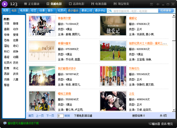 123播放器是一款功能强大的视频播放器软件,主要功能为用户整合了各种视频网站的资源包含了电影,电视剧,综艺,体育等视频,同时还有视频直播功能,让您使用电脑也可收看电视直播节目。