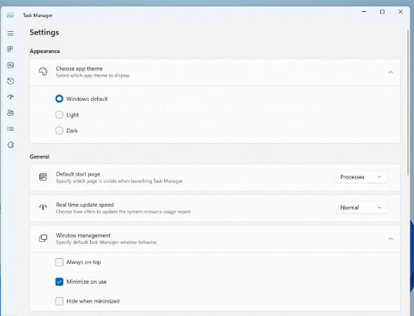 我们更新了任务管理器设置页面,以符合 Windows 11 的设计原则。该设计与 Windows 11 中的设置具有相似的外观和感觉,并提供更清晰的 UI,将类别分为不同的部分。我们也将很快在开发频道中启用此功能。
